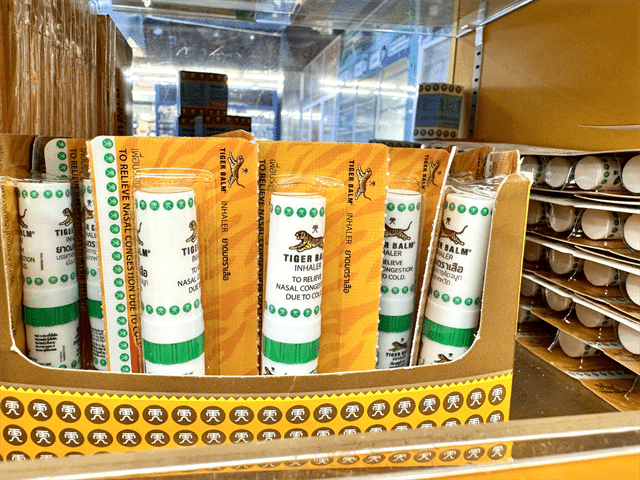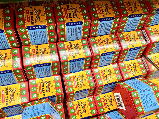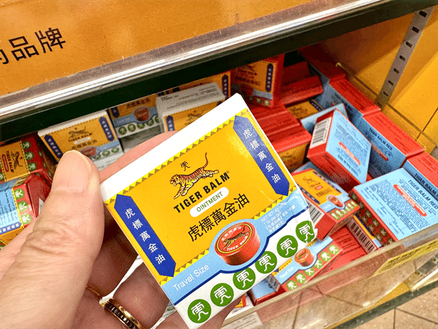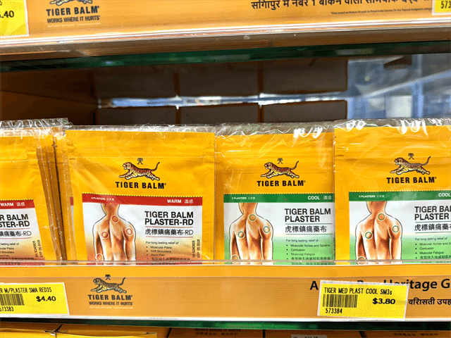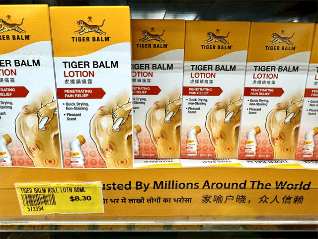 シンガポール発のブランド、タイガーバーム。肩こりや腰痛向けの商品がそろっており、ムスタファセンター1階の薬局エリア近くに置いてあります。