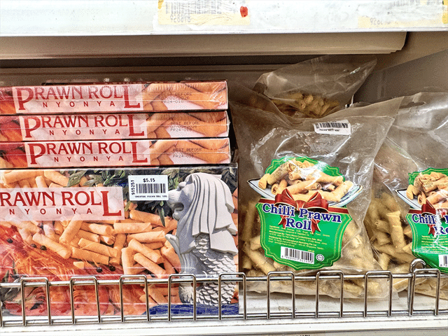 チリプラウンロール(写真左)5.15シンガポールドル(日本円で約592円~)ピリッと辛いエビのスナック菓子です。