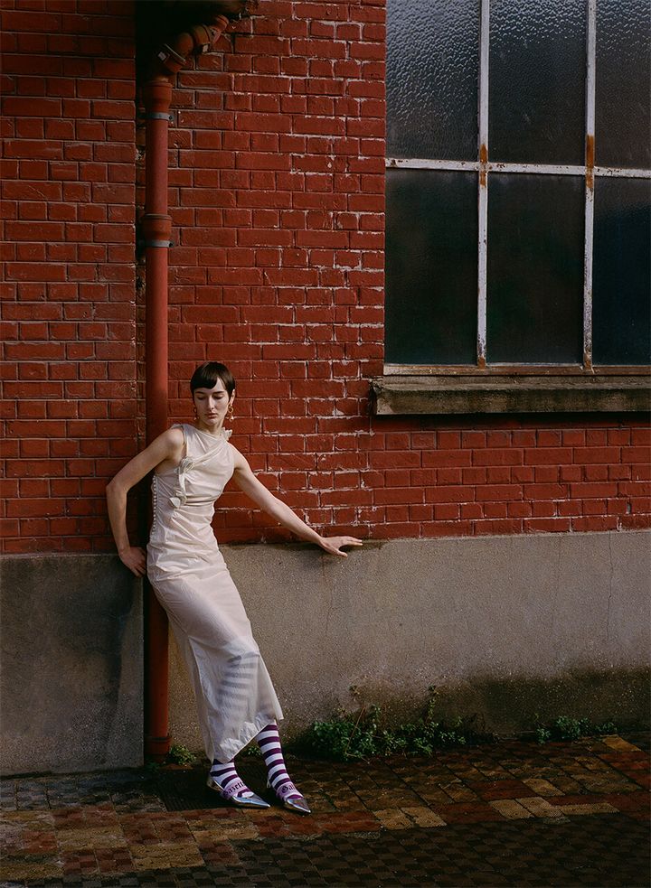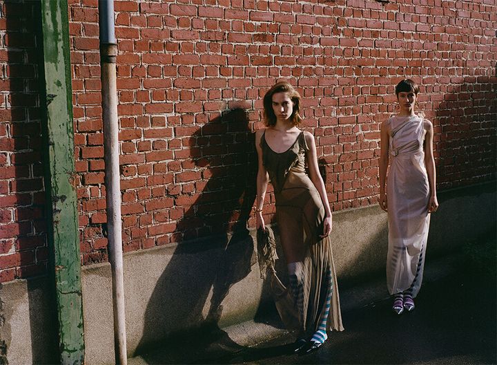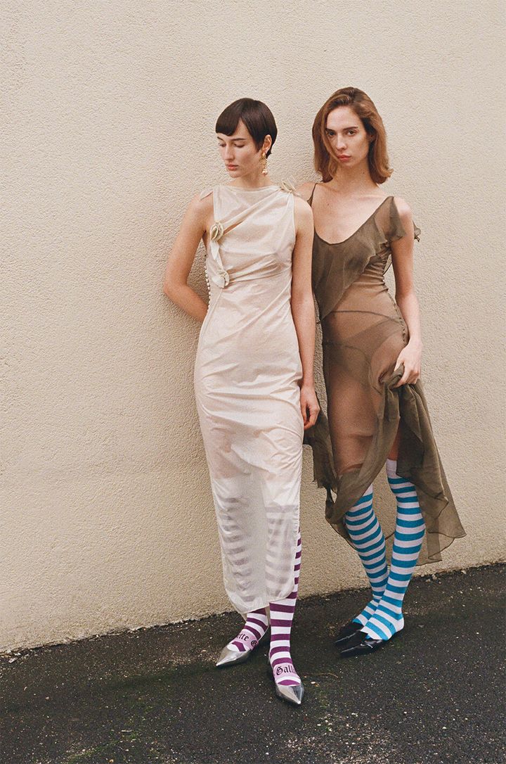 left - dress by COPERNI, shoes by GALIANO, earrings by THE PARISIAN VINTAGE, socks stylist's own right - dress by PLEIN SUD, shoes by KENZO, socks stylist's own