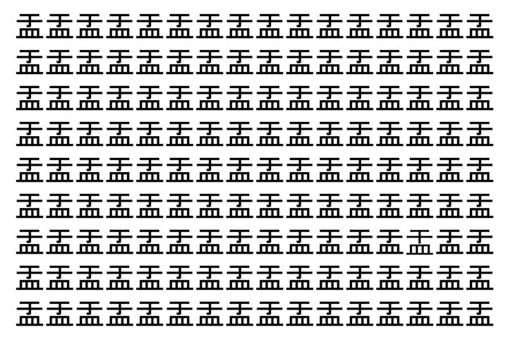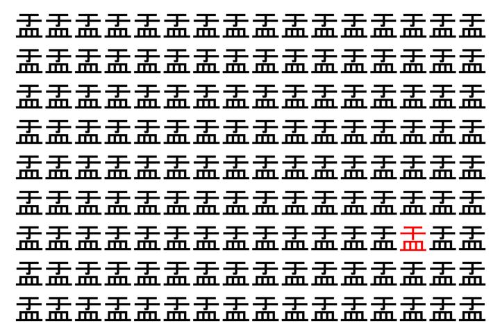 画像の中には、「盂」という漢字が縦に9行、横に16個並んでいます。 全部で144個となりますが・・・、そのうち1つは「異なる漢字」となってますよ!!
