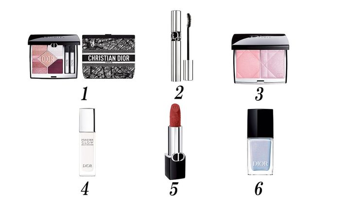 1ディオールショウ サンク クルール 983 ¥11,550(限定)、2マスカラ ディオールショウ アイコニック オーバーカール 090 ¥6,160、3ディオールスキン ルージュ ブラッシュ カラー&グロウ 287 ¥8,470、4ディオールスキン フォーエヴァーグロウ マキシマイザー パーリー ¥5,940、5ルージュ ディオール 720V ¥6,270(限定)、6ディオール ヴェルニ 207 ¥4,620(限定)/パルファン・クリスチャン・ディオール