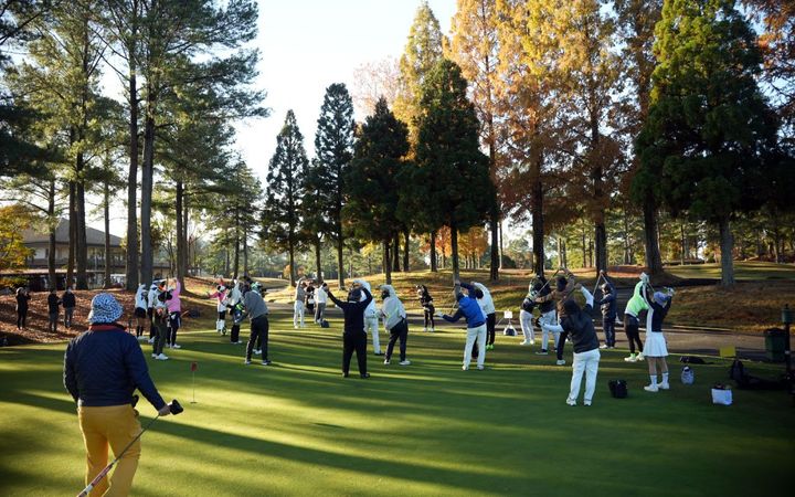ストレッチの後にはパターのワンポイントレッスン。古江プロによるデモンストレーションショットやパッティングルーティンも披露されました。古江プロは、ボールからピンまでの距離、ピンからボールまでの距離を両方、歩測しているんだとか。勉強になります! 参加者たちは、写真や動画を撮ったり質問をしたりと、スタート前から和気あいあいとしたムードに包まれました。