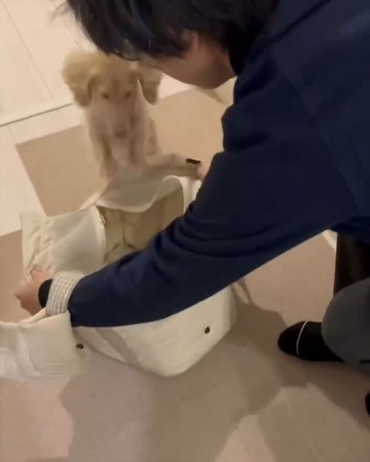 飼い主さんが犬用のキャリーバッグを置くと、ちゃちゃちゃんはジャンプを止めて・・・