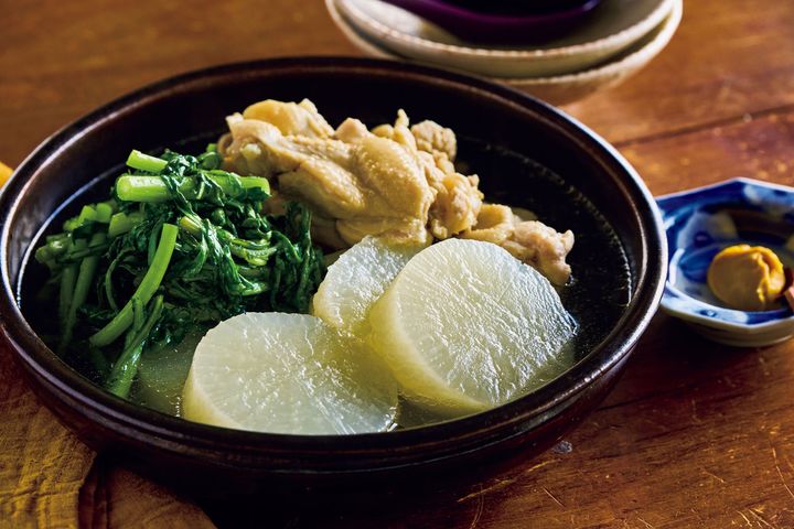 口径約20cmの鍋に煮汁の材料、大根と手羽元を入れて中火にかける。煮立ったらアクを取って落としぶた※をし、弱火で30分ほど煮る。煮汁を少し残して器に盛り、鍋に春菊の茎、葉を順に加えてさっと煮る。器に盛り、好みで辛子適宜を添える。