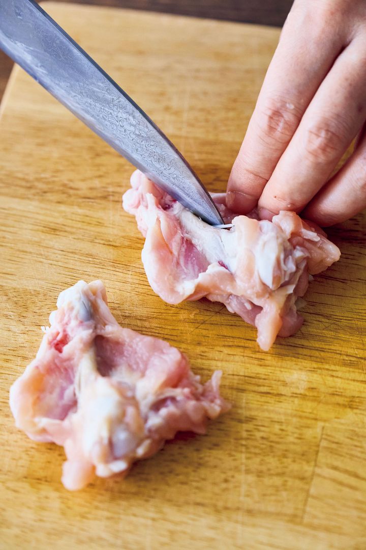 手羽元は皮目を下にしてまな板に置き、骨の両側に切り込みを入れる。