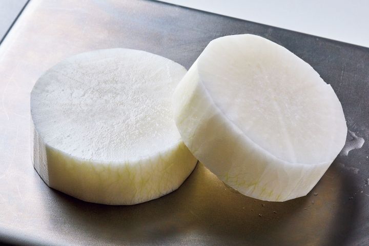 大根は幅2cmの輪切りにして皮をむき、両面に浅く十字の切り込みを入れる。水にさっとくぐらせて耐熱皿にのせ、ふんわりとラップをかけて電子レンジ(600W)で5分ほど加熱する。春菊は葉と茎に切り分け、茎を長さ5cmに切る。
