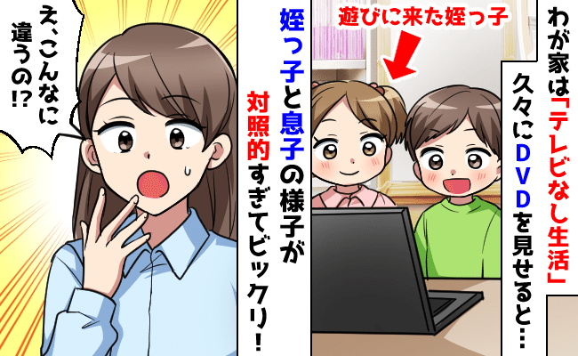 3歳と1歳の男の子を育てている私。テレビがあると、テレビに集中して普段の家族の会話が減ってしまうと考えた私たち夫婦は、テレビがない生活を選択しています。ある日、妹家族が自宅へ遊びに来たとき、子どもたちの反応に大きな違いがあることに気づくのです。
