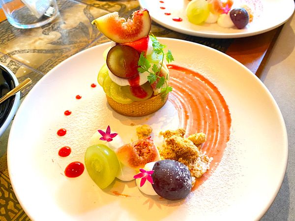 出てきたタルトを見てビックリ!私はてっきり1カットのタルトをさらに半分に切ったものがお皿に乗ってくると思っていたのです。しかし出てきたのは丸いタルト。聞くと、タルトをおいしく食べてもらいたいので常温で置いたタルトに注文が入ってからデコレーションしているとのことでした。 だから半分ずつにしてもこんなにスペシャルなタルトをいただくことができました。しかもシャインマスカットだけでなくピオーネもサービスしてくれました。幸せ。