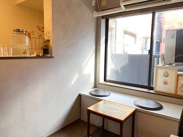 2階は普通のテーブル席が2つ。ほかに椅子と同じ高さのテーブルのある席が3つあります。お水はセルフです。