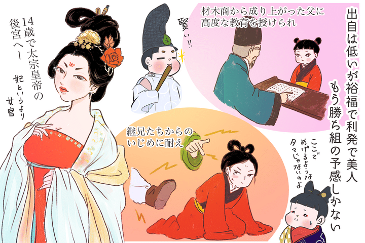 中国史上唯一の女帝となった人の出自は意外にも傍流貴族。しかし身分は高くなくとも父親が材木商から地方の長官に成り上がった人物で、商才と出世欲、そして財産がしっかりあったことがわかります。