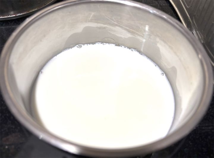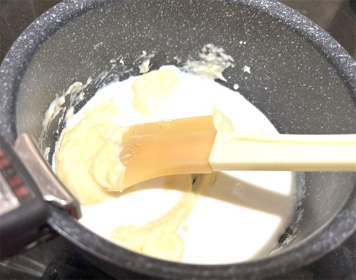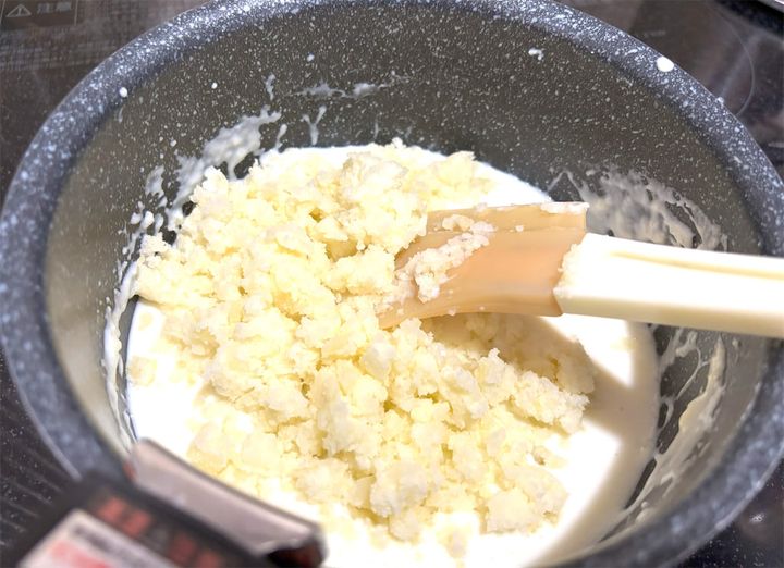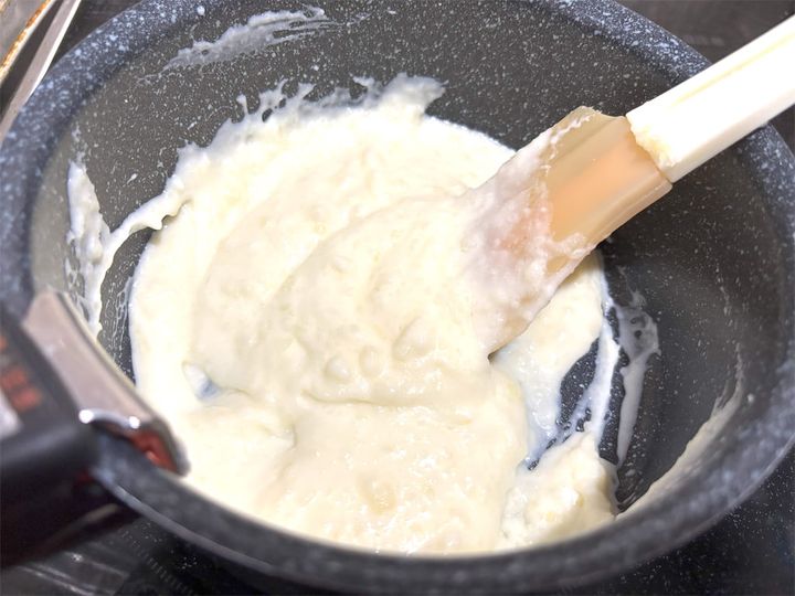 小麦粉がペースト状になるように炒めたら、火から外して1の温めた牛乳を数回に分けて加えます。