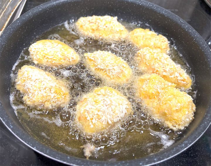 成形と衣付けが完成したら、揚げ油(今回はこめ油を使用、分量外)で揚げていきます。