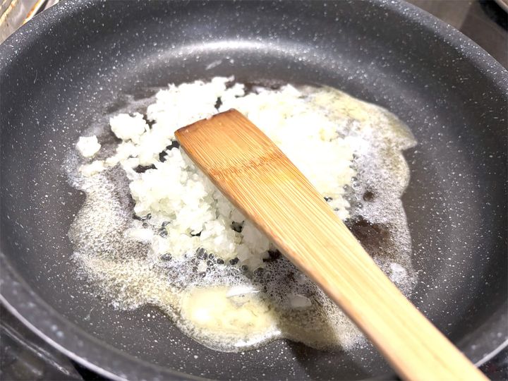 フライパンにバターを入れて熱し、1のみじん切りにした玉ねぎを炒めます。
