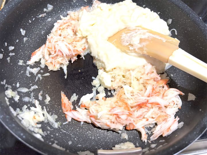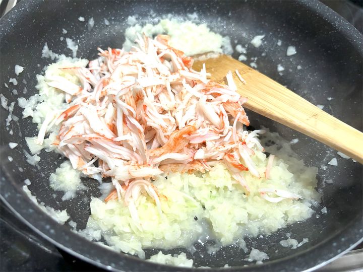 玉ねぎの色が変わらない程度に弱火(IHクッキングヒーターだと140℃前後)で炒めたら、カニカマを加えてさらに炒めます。