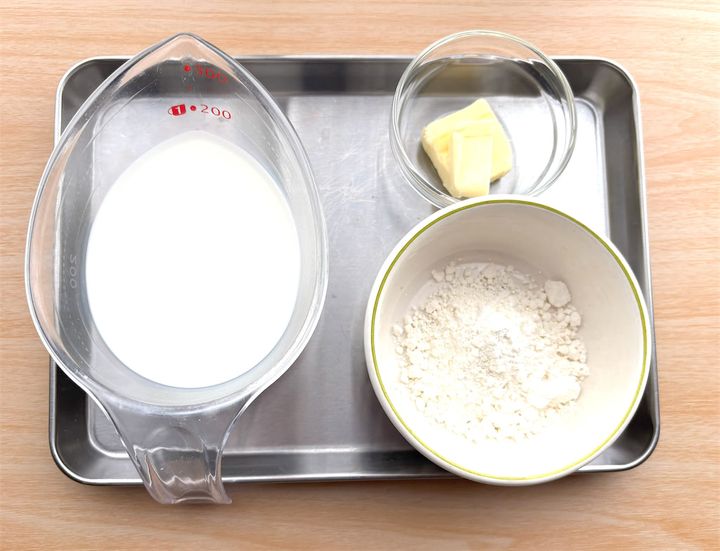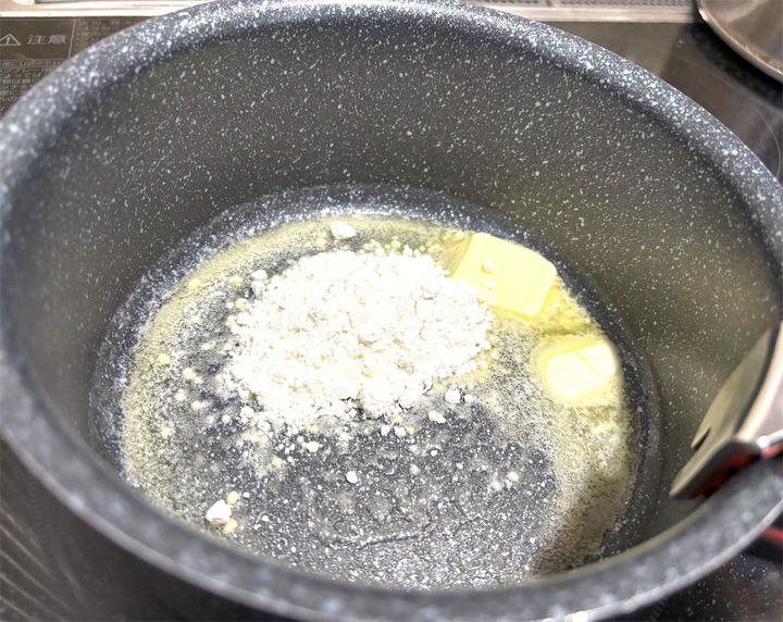 鍋にバターを熱し、小麦粉を入れて極弱火(IHクッキングヒーターだと140℃以下)で炒めます。