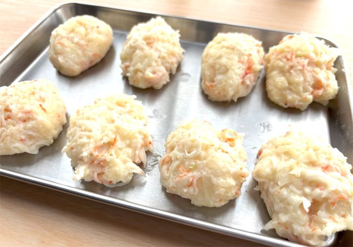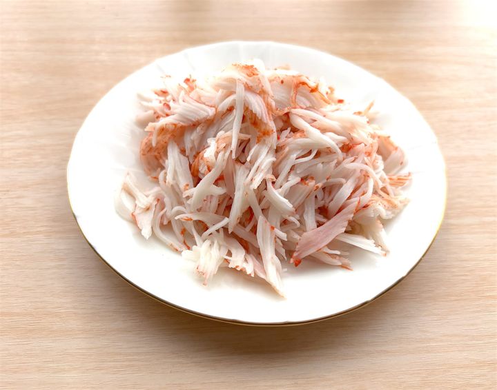 カニカマは、あらかじめ細かくほぐしておきましょう。