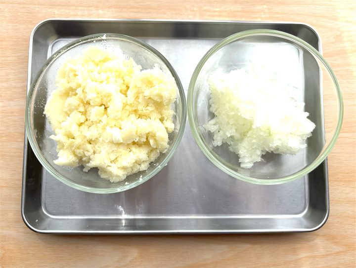 玉ねぎはみじん切りに、じゃがいもは皮を剥いて茹でて潰しておきます。