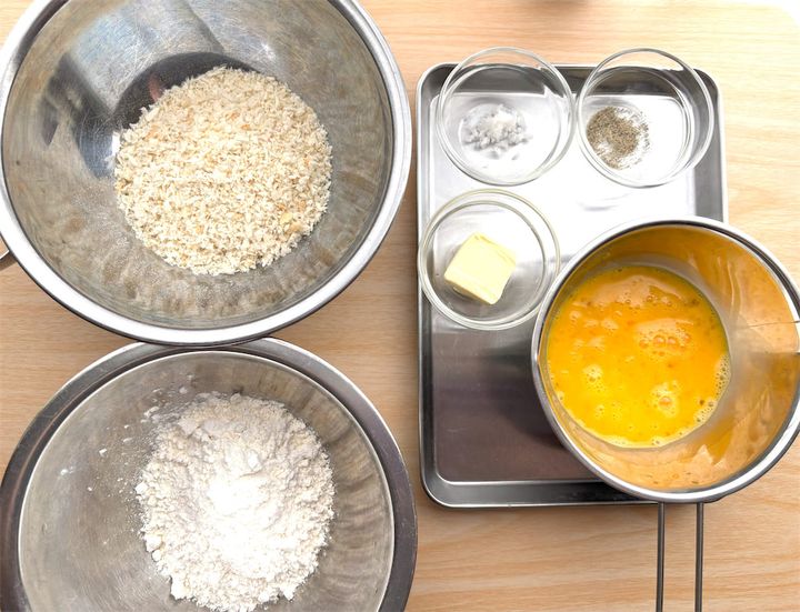成形したら、小麦粉→溶き卵→パン粉の順番に衣を付けます。