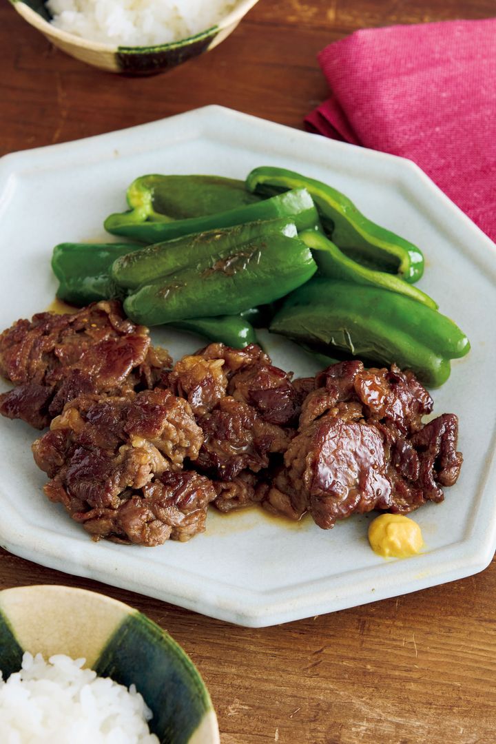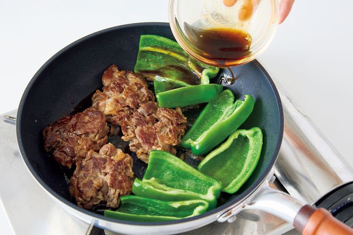 (2)フライパンにサラダ油小さじ1を中火で熱して(1)の牛肉を入れ、あいたところにピーマンを切り口を上にして並べる。そのまま3分ほど焼き、肉に焼き色がついたら肉の上下を返し、照り焼きだれを加える。強火にし、フライパンを揺すりながら肉にたれをからめ、かるくとろみがついたら全体にからめて器に盛る。練り辛子適宜を添える。