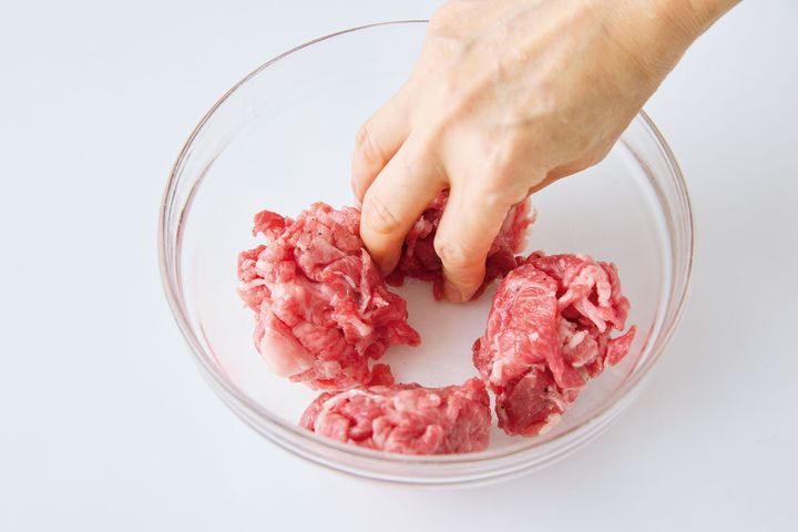 つなぎを使わずにまとめた牛肉はくずれやすいので、バラバラにならないように、片面をしっかり焼きつけてから上下を返し、フライパンを揺すってたれをからめます。
