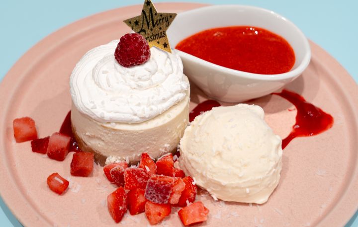 おすすめの食べ方は、まずはレアチーズケーキをそのまま楽しんだ後、「Melty Ice バニラ」を添えて一口。さらに、ストロベリーソースをたっぷりとつけることで、甘酸っぱく爽やかな風味に変化します。