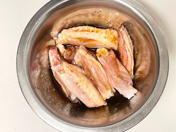 1. ボウルににんにく、しょうゆ、手羽中を入れて揉みこみます。
