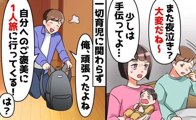 さらに、「いや~、育児休暇は大変だなぁ。この1カ月間、俺、頑張ったよね。自分へのご褒美に明日から一人旅に行ってくるわ!」と驚きの行動に出ようとします。