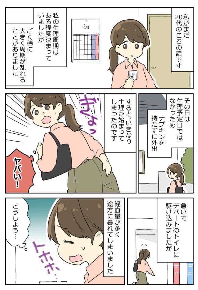 その日は生理予定日ではなかっため、ナプキンを持たずに外出。すると、いきなり生理が始まってしまったのです。 急いで買い物をしていたデパートのトイレに駆け込みましたが、経血量も多く途方に暮れてしまいました。