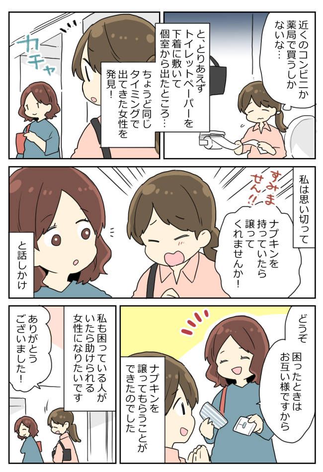 私は思い切って「もしナプキンを持っていたら譲ってくれませんか!」と声をかけ、女性から「持っているからあげるね。困ったときはお互い様だよ!」とナプキンを譲ってもらうことができたのでした。
