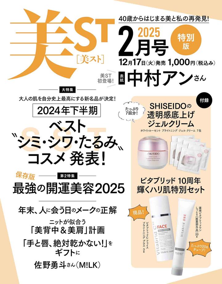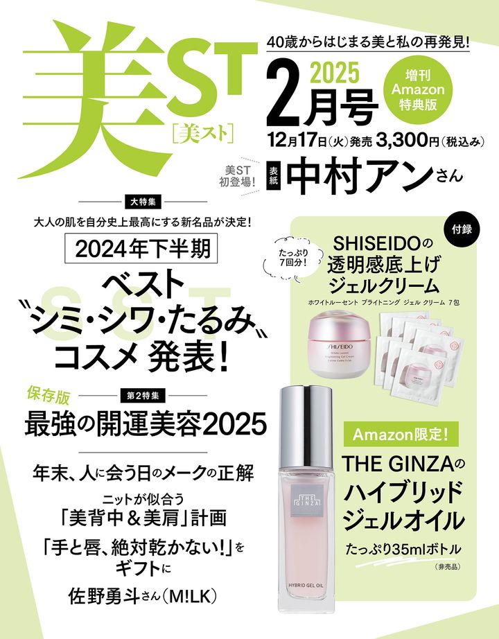 12月17日(火)発売・美ST2月号のネット書店での予約受付がスタート!中村アンさんが美ST初表紙を飾ります。共通付録はSHISEIDOのジェルクリーム、本誌にはルルルンのシートマスク、特別版にはビタブリットのビタミンCケアパウダー現品&オールインワンジェルのたっぷりチューブが付録に。さらに、増刊Amazon特典版はTHE GINZAのジェルオイルのたっぷりボトルが付録です!豪華付録につき完売必至です、ぜひお早めにご予約ください!