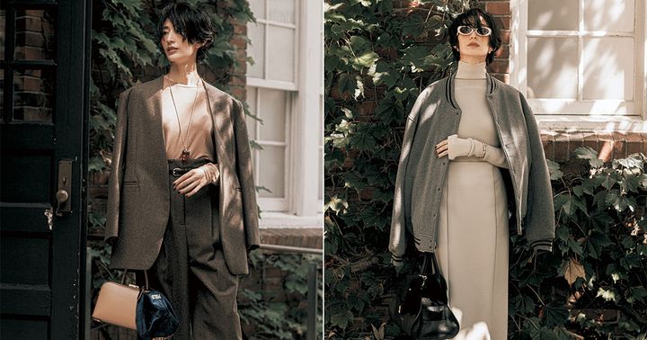 肌がきれいに見える、気品あるニュートラルカラーもダイアナ妃ファッションの要。くすみワントーンのセットアップは、すぐに真似できるテクニック!