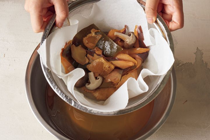 ボウルにざるとペーパータオルや布巾を敷いて2を注いでこす。
