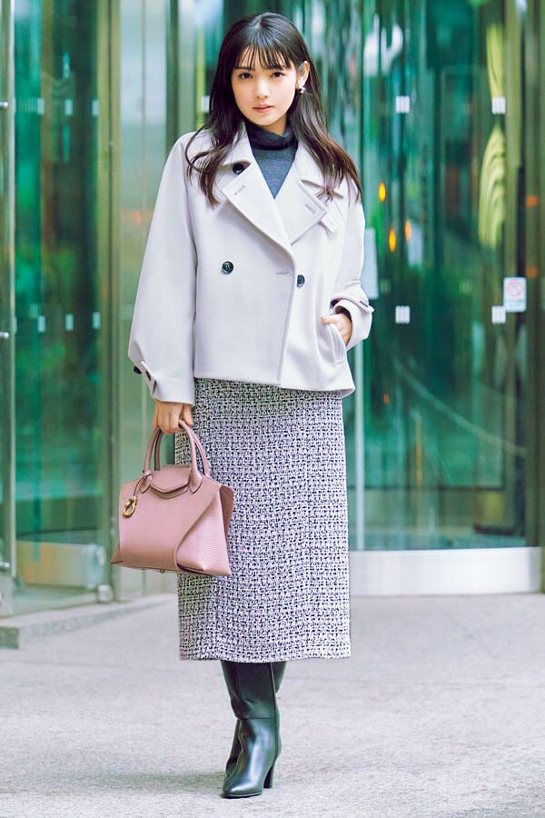 通勤ペンシルのスタメンと言えばやっぱりツイード。カラーツイードで遊び心を盛り込みつつ、端正なWコートできちんと感を念押し。