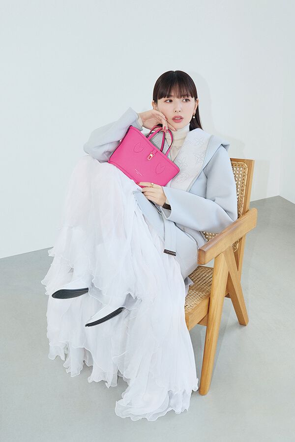 冬の装いを華やかに変える、ヴィヴィッドなピンクのグレインレザー。裏面はピンクのトリミングを施したモノグラム・キャンバス。ストラップのほか、グレインレザーと同色のポーチも付属する。ネヴァーフル・インサイドアウト BB バッグ[H16.5×W26.5×D11]¥388,300、コート¥852,500、ニット¥162,800、スカート参考商品、ピアス¥74,800、リング¥72,600、靴¥294,800/以上ルイ・ヴィトン(ルイ・ヴィトン クライアントサービス)