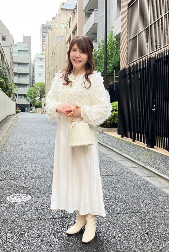 クローゼットの中はお気に入りの一軍服だけと話す飯塚さん。この日の装いは、飯塚さんが大好きなブランド「スナイデル」のカーディガンと「セルフォード」のワンピースを合わせたオールホワイトコーデ。「今年購入したカーディガンは、形が理想的で、もう1着ゲットしました。ワンピースも3、4年愛用しているお気に入りです」
