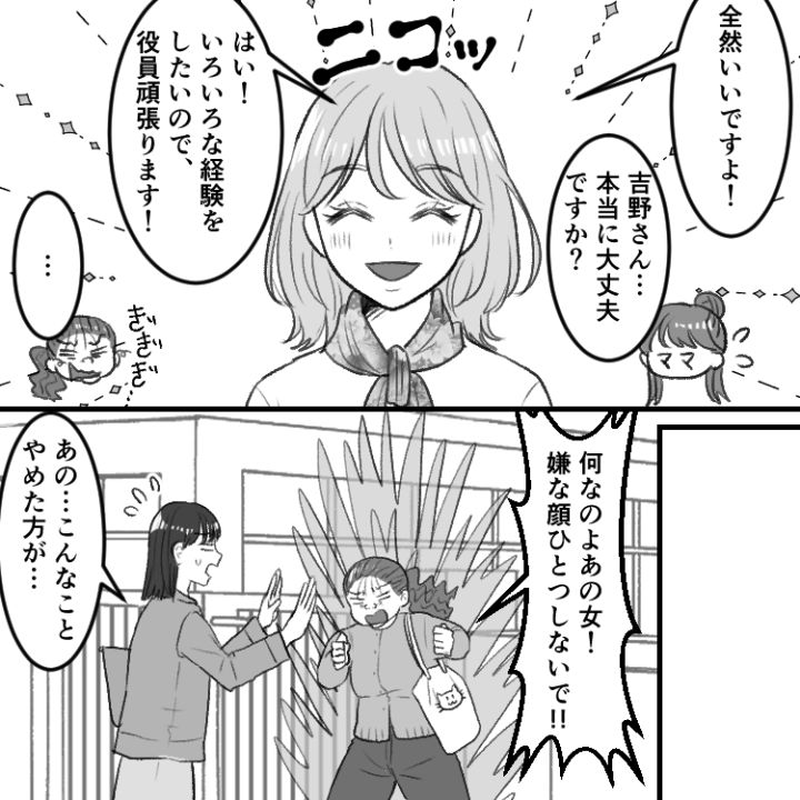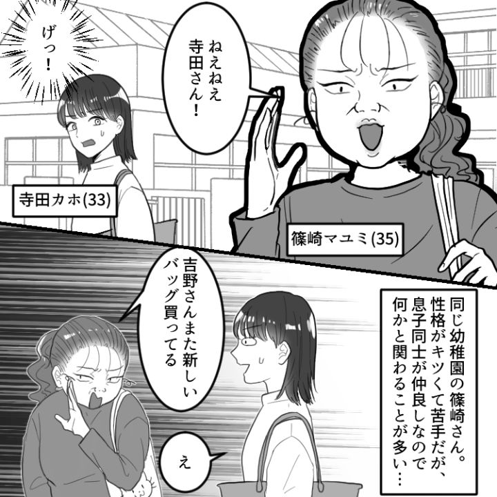 カホと同じ幼稚園に通うママ・篠崎さんは性格がきつく、仕切りたがり屋の性格。馬が合わないと思いつつも、息子同士が仲良しなため、適度な距離感で付き合うようにしていた。そんなある日、同じ幼稚園の美人ママ・吉野さんのことが気に入らないと話す篠崎さん。PTA役員を無理やり押し付けたりなど、早速吉野さんに嫌がらせを仕掛ける彼女がどんどん大暴れしていくことに!?