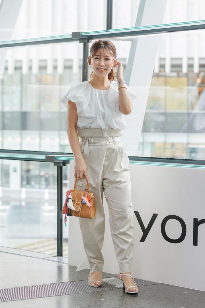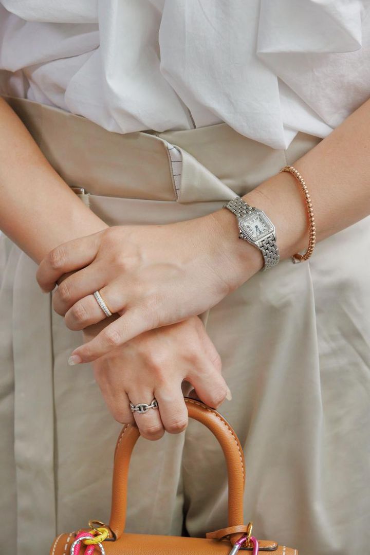 ring/BOUCHERON(左手)・HERMÈS(右手) watch/Carteir tops/Mila Owen pants/FREY bag/DELVAUX sandals/楽天