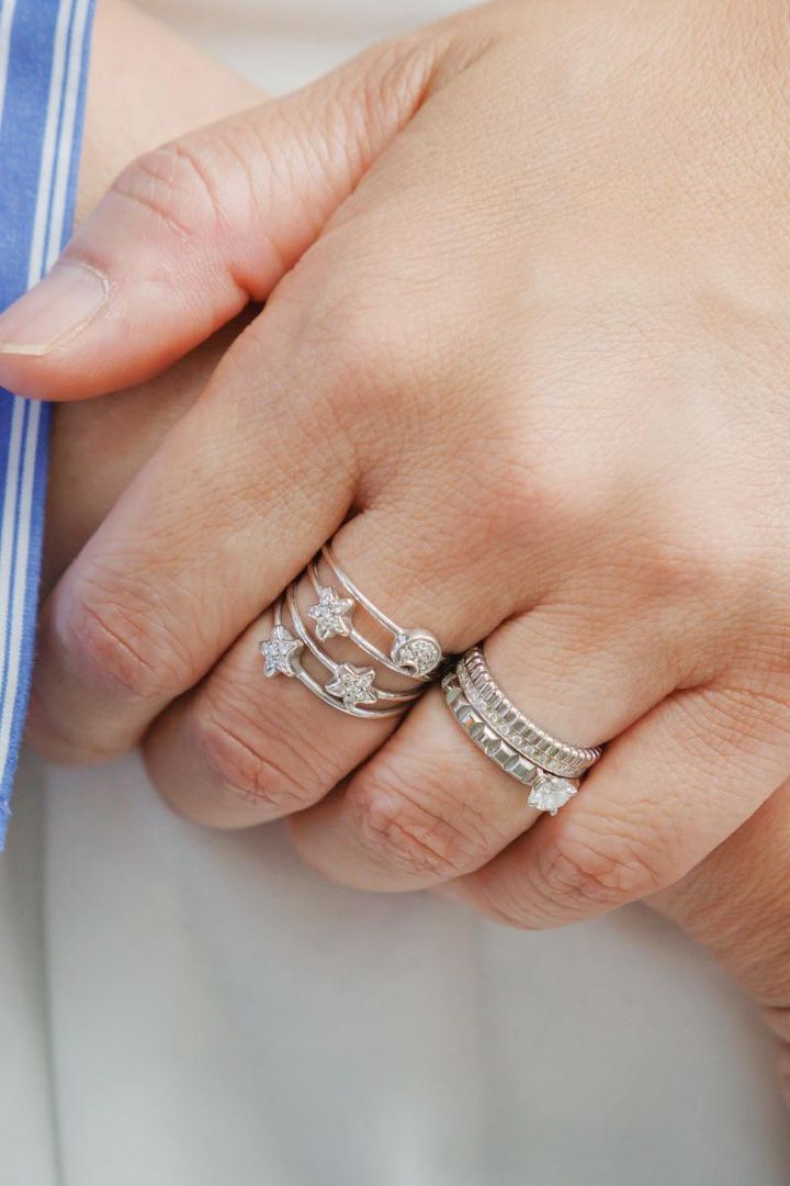 「6年前に夫がサプライズで贈ってくれたキャトルクラシック。結婚指輪と最近お気に入りのdecollte accessoryのリングを合わせました。実は夫が購入する際、指のサイズがわからず私のジュエリーをこっそり持ち出し、無事ジャストサイズを買えたというのも思い出のエピソードです(笑)」山田真子さん・39歳(主婦/長男21歳・5歳と1歳の女の子ママ)