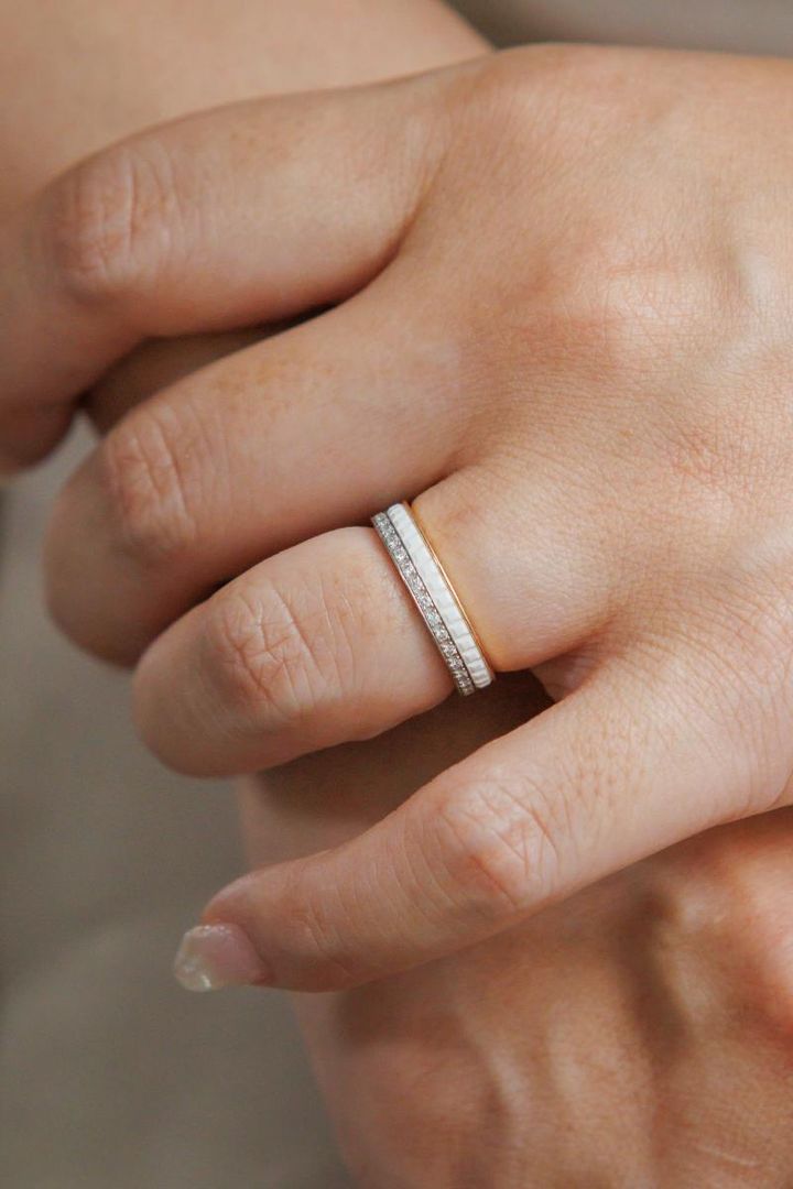 「ずっと憧れていたキャトルリング。実は、夫の指が太くなってしまったのを機に、セカンドマリッジとして購入しました(笑)。白を基調とした華奢なデザインが手元を上品に見せてくれるので、家事や仕事で指が目に入るたびに心が躍り、気分が上がります」中川弘美さん・35歳(会社経営/7歳の男の子と6歳と0歳の女の子ママ)