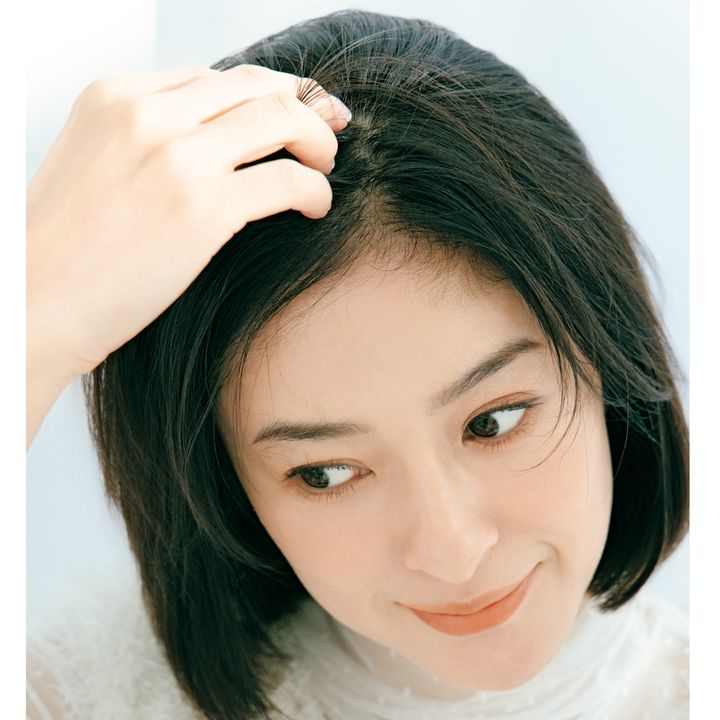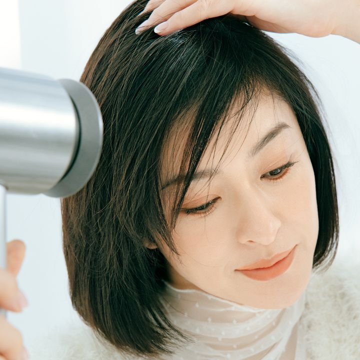 2.ドライ後、前から髪をかき上げて自然に分かれたところを分け目に。作りこまないほうがボリューミーなスタイルに。
