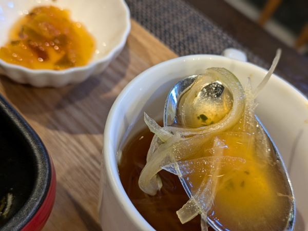 そして懐かしさを感じる日本のカレーには、福神漬けがやっぱり合う!玉ねぎたっぷりのコンソメスープも深い味わいで、カレーと交互に美味しく完食しました。