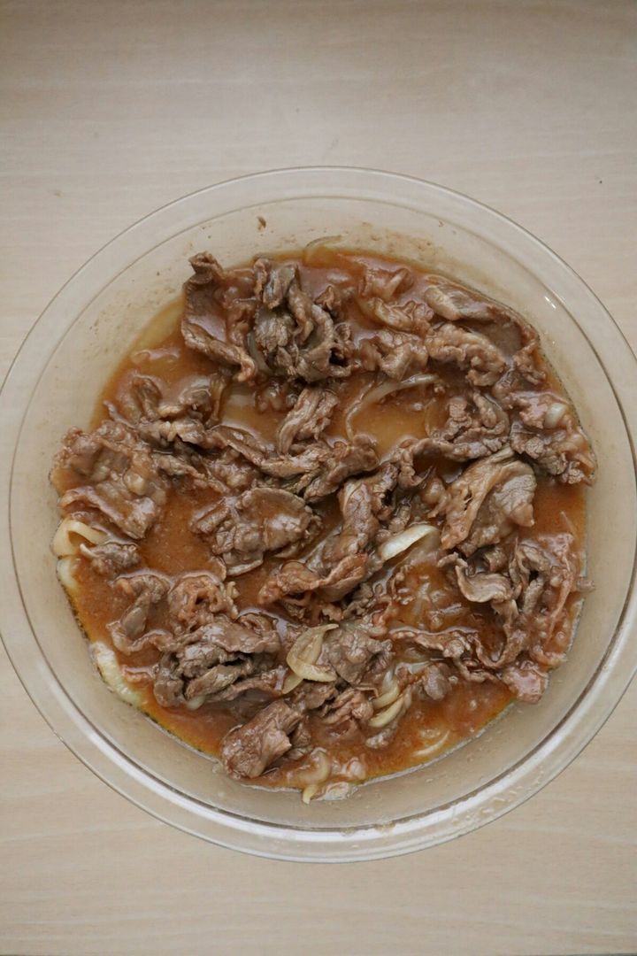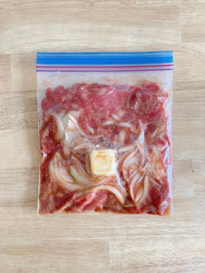 下味冷凍しておくことで、お肉に味が染みこみ絶品に仕上がりますよ。また、玉ねぎと牛肉を密着して保存しておくことでお肉が柔らかく仕上がります。