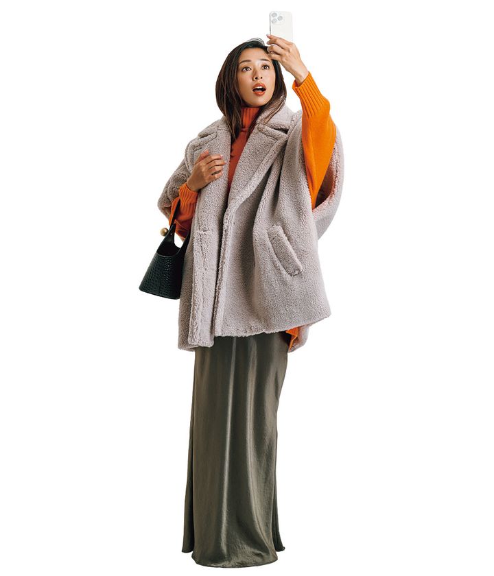 夜のお出かけには上質なカシミア素材のタートルニットに半袖のボアコートを合わせてオシャレと防寒の両立を。光沢感のあるサテンスカートが煌めくイルミネーションとともに夜の高揚感を後押ししてくれそう。