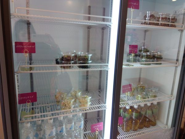 店内に入ると、左手がお茶、お水、要冷蔵のお総菜が入っている冷蔵ショーケース、右手にはお総菜がずらり~。そして正面がレジですよ。