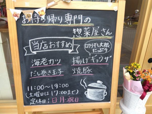 ふらっと寄れる、手作りの持ち帰り専門の総菜屋♪ お店に入る前に、店頭の立て看板に書かれた店おすすめをチェック!