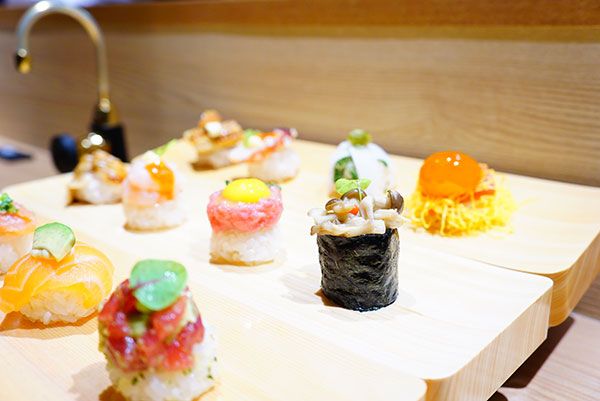 メニューは、定番のネタから季節の食材まで幅広く取り揃え、見た目も可愛らしい一品が並びます。 定番の鮮魚だけではなく、意外な食材も使用した創造性の高いてまり鮨が楽しめます。 お任せのコースとして「てまり12貫」3,080円、「てまり16貫」4,180円を提供(*お椀付き 税込価格)。 当面はこの2メニューですが、今後は他にも順次プラスしていく予定です。
