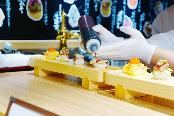 ネタにはアボカドなどの洋風テイストから、玉寿司で初めての試みでチリソースなどの調味料を採用。今までとはちょっと違うお寿司との出会いを用意しています。例えば、「お月見モンブラン」をイメージした組み合わせは、燻製の卵黄をモンブランの栗に見立て、錦糸玉子をマロンペーストに見立てた一品で、SNS映えも抜群です。