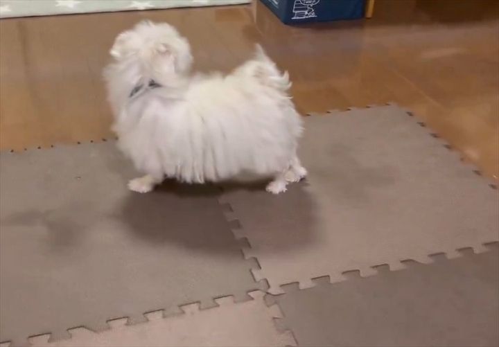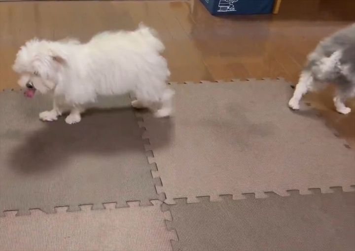 ジョイントマットの上に立つマルチーズが・・・