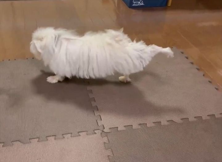 後ろ足をピーン!マルチーズは足を伸ばすエクササイズ中!?