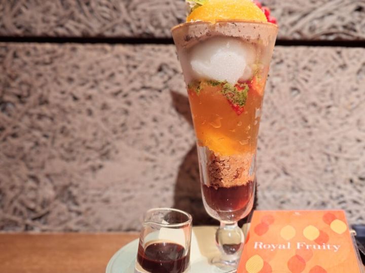 夜パフェとしていただいたのは「ロイヤルフルーティー(税込1,980円)」。ロイヤルミルクティーのアイスとクリームに、フルーツやショコラが共演するパフェです。